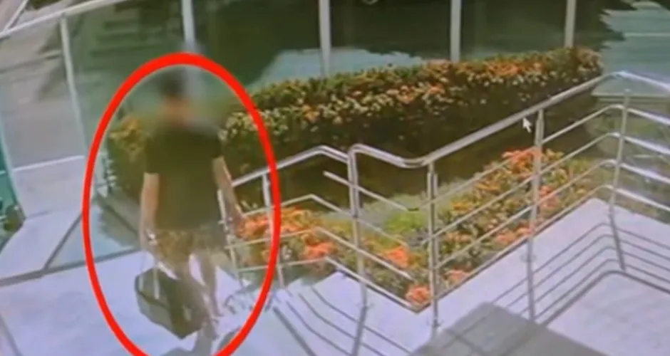 Imagens de câmeras de videomonitoramento, registraram o momento em que o suspeito sai do prédio levando uma bolsa