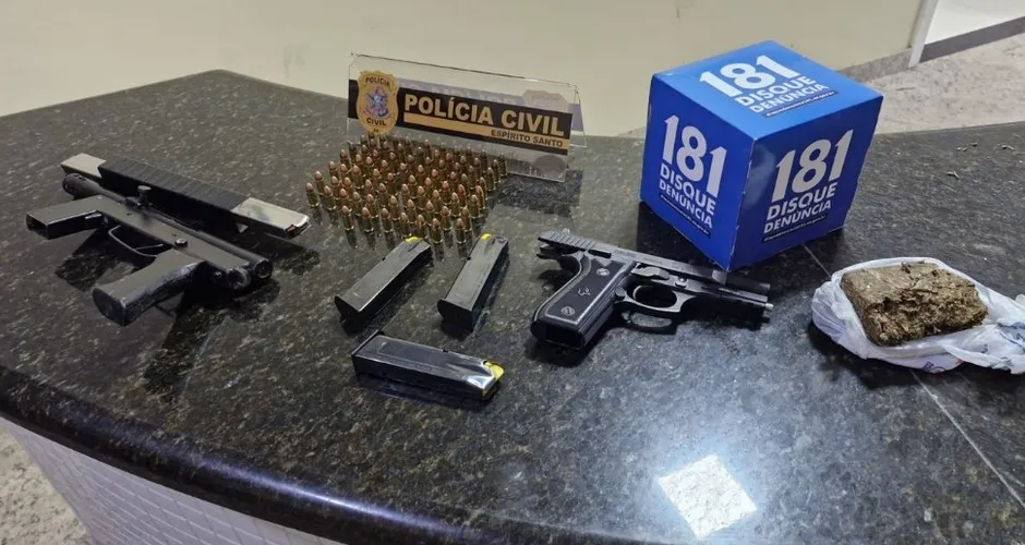 No imóvel utilizado como esconderijo, foram apreendidos uma submetralhadora calibre 9mm, 77 munições do mesmo calibre e aproximadamente 180 gramas de substância análoga à maconha. A arma apreendida com o suspeito alvejado foi identificada como produto de roubo ocorrido no município de Linhares.