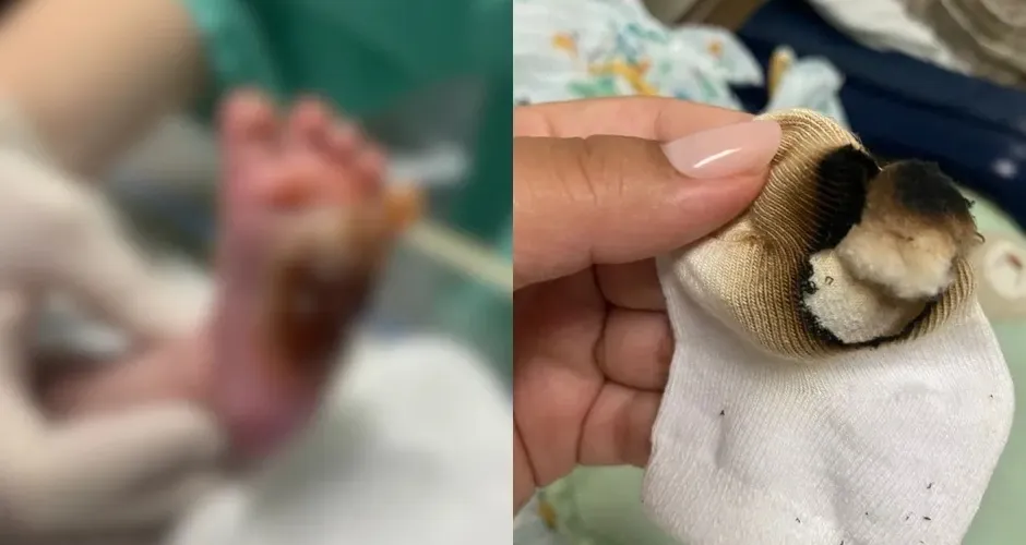A avó percebeu que ele estava chorando e que o pezinho direito estava com uma cor diferente. Quando elas tiraram a roupa do bebê, viram naquele momento que o bebê tinha uma queimadura, uma lesão, segundo Thais Cruz.