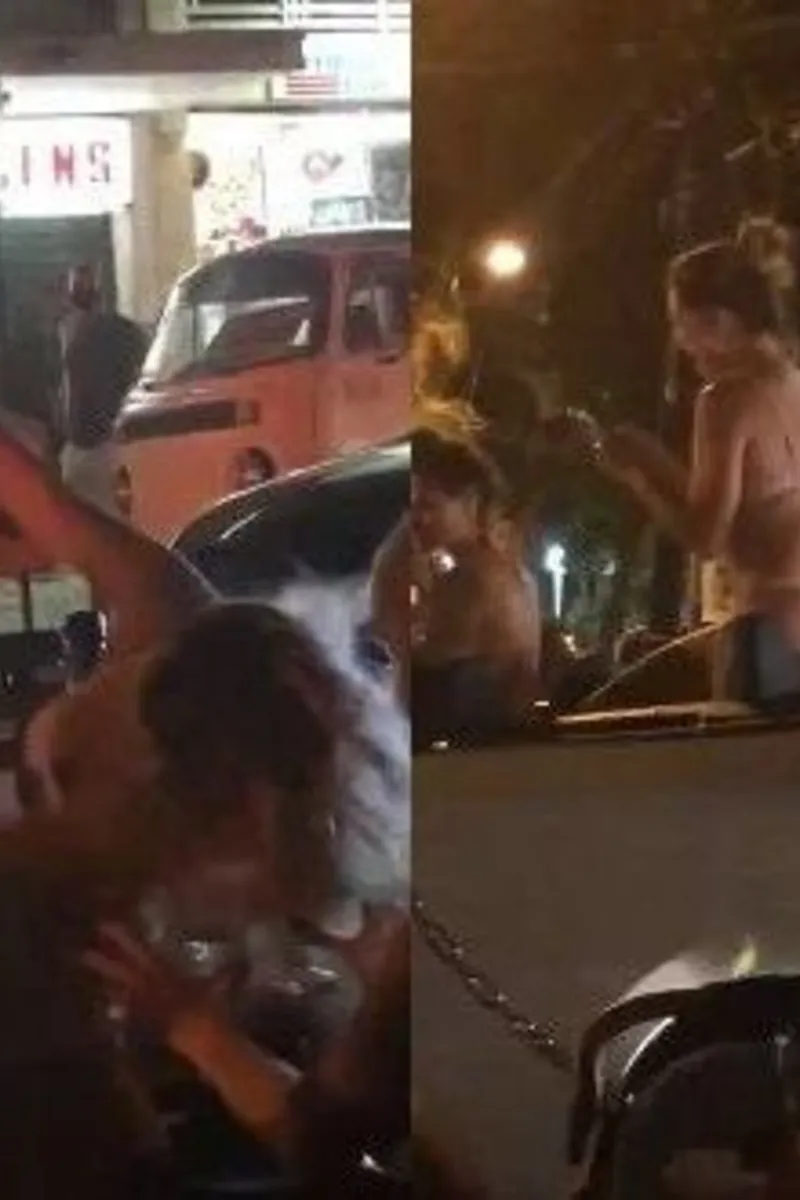 Um homem que também estava sentado na mesa correu atrás da mulher, que voltou para o carro. Ele só teve tempo de puxar a parte de cima do biquíni dela, que cobriu os seios com as mãos.