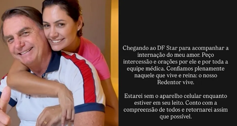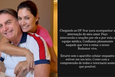 A ex-primeira dama Michelle Bolsonaro disse na manhã desta quarta-feira, 24, que estava chegando ao hospital DF Star, em Brasília, para acompanhar a internação do ex-presidente da República Jair Bolsonaro (PL). Em publicação no Instagram, ela pediu intercessão e orações pelo ex-presidente e por toda a equipe médica.