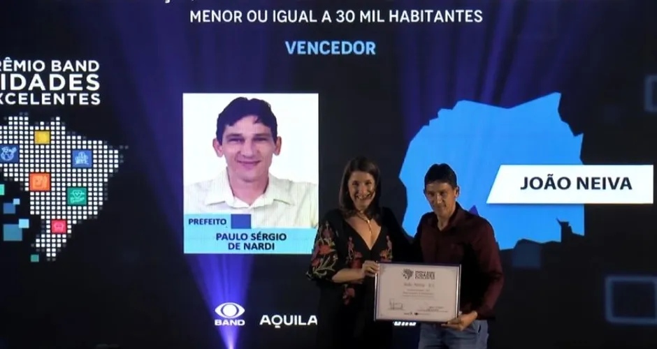 Primeiro lugar na categoria de cidades menor que 30 mil habitantes ficou com João Neiva, representada na premiação pelo prefeito Paulo Sérgio de Nardi |  Foto: - Reprodução