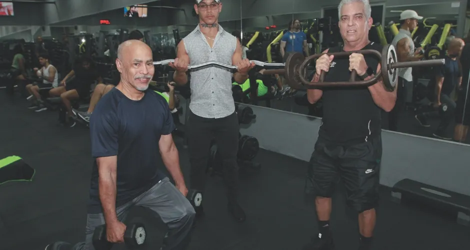 O auxiliar de produção de gráfica Kaio Gomes, de 21 anos (no centro), faz musculação há cinco anos e já perdeu 31 quilos. “Acredito que a musculação é a 'fonte da juventude' que temos acesso atualmente”.