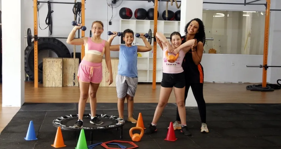 Orientados pela profissional de educação física Rafaela Ferreira, as crianças participam das aulas de funcional kids na Dream Fit.
