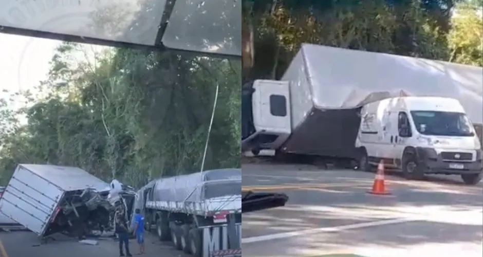 BR 101 fica interditada após acidente entre van, carreta e caminhão no Sul do ES
