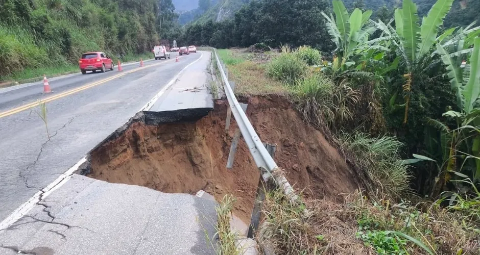 O temporal que atingiu a Região Serrana do Espírito Santo na tarde dessa quinta-feira (19) causou estragos em um trecho da BR-262, na altura de Venda Nova do Imigrante. Imagens divulgadas pela Polícia Rodoviária Federal (PRF) mostram que, no quilômetro 101, uma erosão comprometeu parte da pista e formou uma cratera.