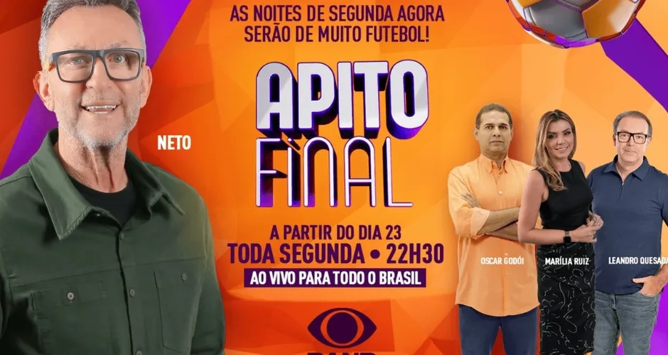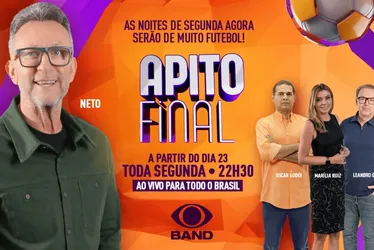 O programa Apito Final, comandado pelo apresentador craque Neto, vai estrear em novo horário a partir desta segunda-feira (23), na tela da TV Tribuna/Band. A atração esportiva da Band ganha um novo horário estratégico para consolidar as análises da rodada do futebol brasileiro após o término dos jogos do final de semana.